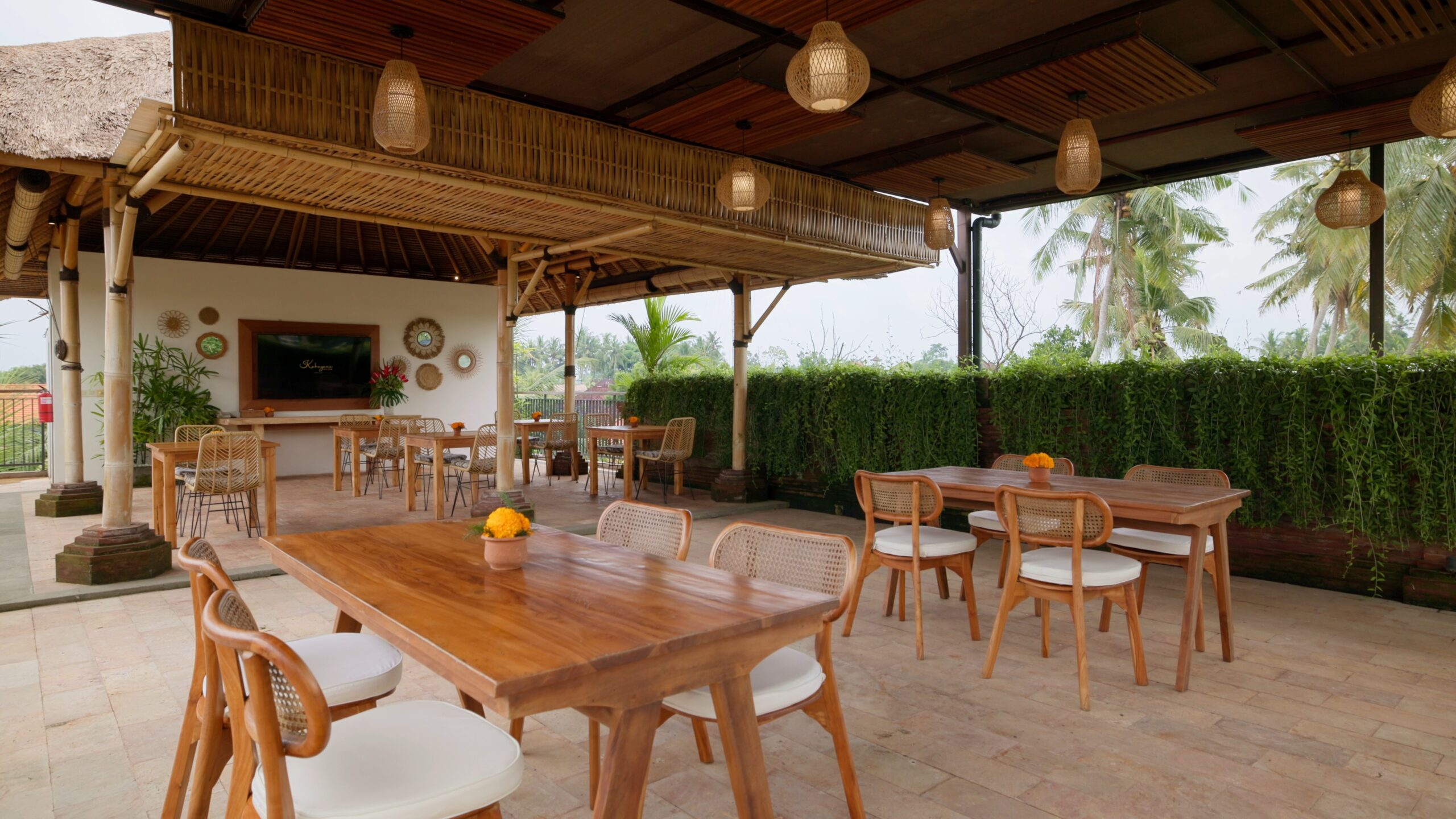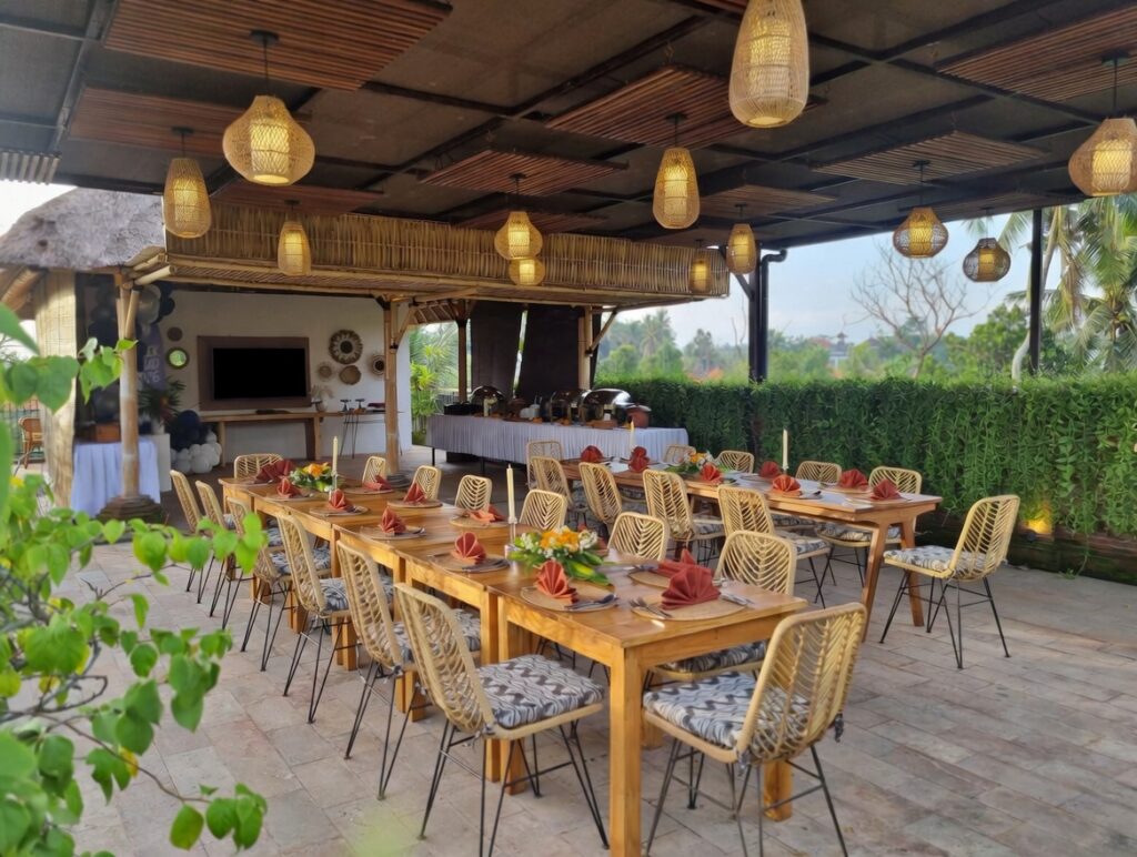 Nestled amidst the serene beauty of Lodtunduh, just minutes from the Ubud Center, Kahayana Suites offers a peaceful and elegant retreat designed for unforgettable events. Our venue “Bale Ambu” provides the perfect setting for corporate meetings & gatherings, private celebrations and dinner. Our signature space, the Bale Ambu Rooftop, features an open-air layout that accommodates up to 40 guests, offering stunning views of the tropical landscape.